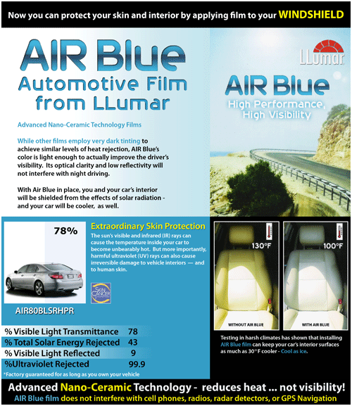 LLumar® Window Film's launch of AIR Blue automobile windscreen film could not come at a better time. AIR Blue dramatically reduces irreversible damage to human skin and vehicle interiors due to harmful ultraviolet (UV), visible, and infrared (IR) rays that penetrate ordinary window glass, while keeping the vehicle significantly cooler.